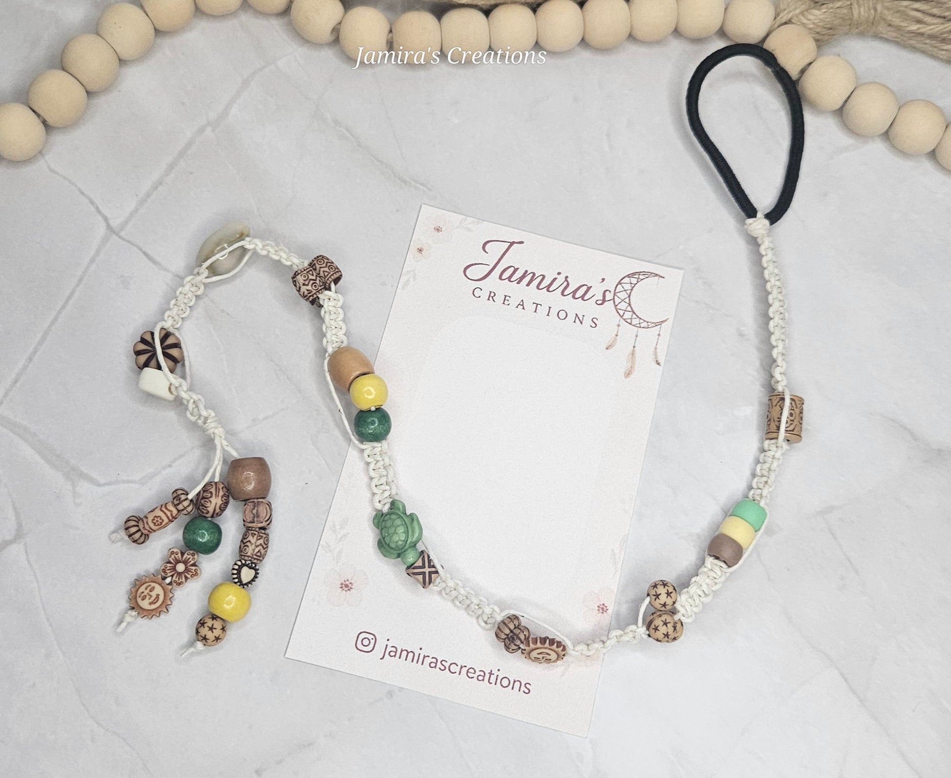 This macramé piece has an elastic band or bow so you can put it on and take it off whenever you want.