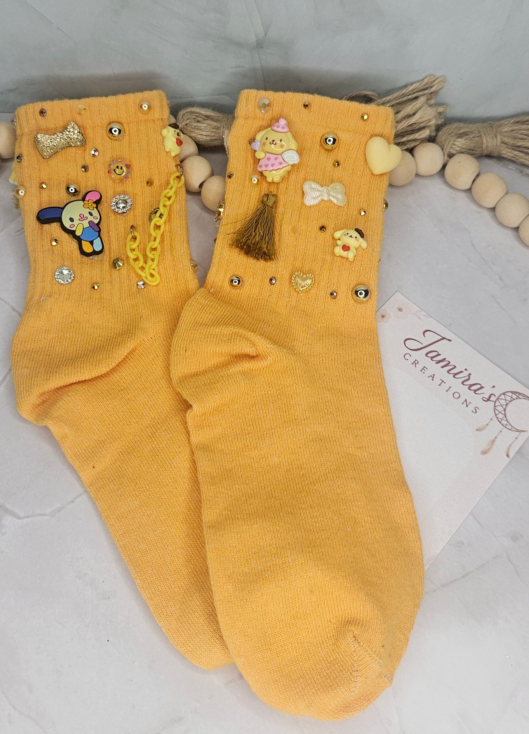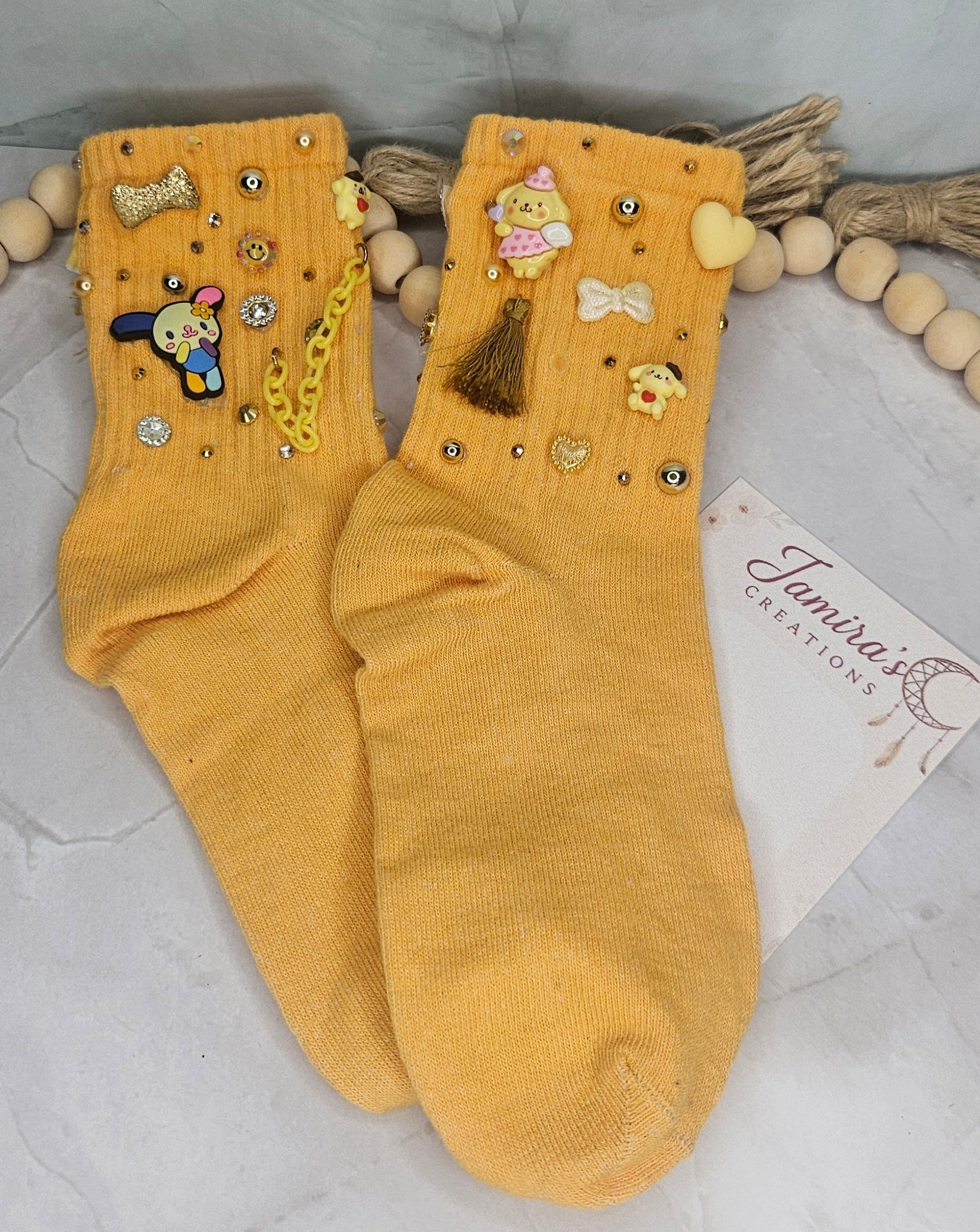 "These decorated socks are made to stand out with style and personality. Featuring unique designs, charming colors, and a handmade touch, they’re perfect for adding joy and cuteness to any outfit. Cozy, comfy, and absolutely adorable!"