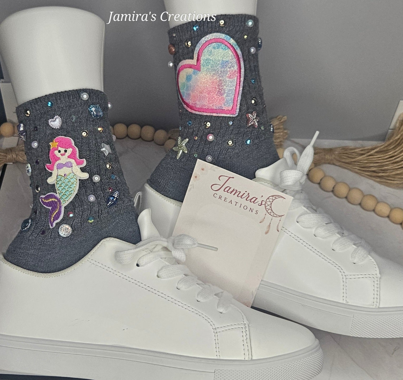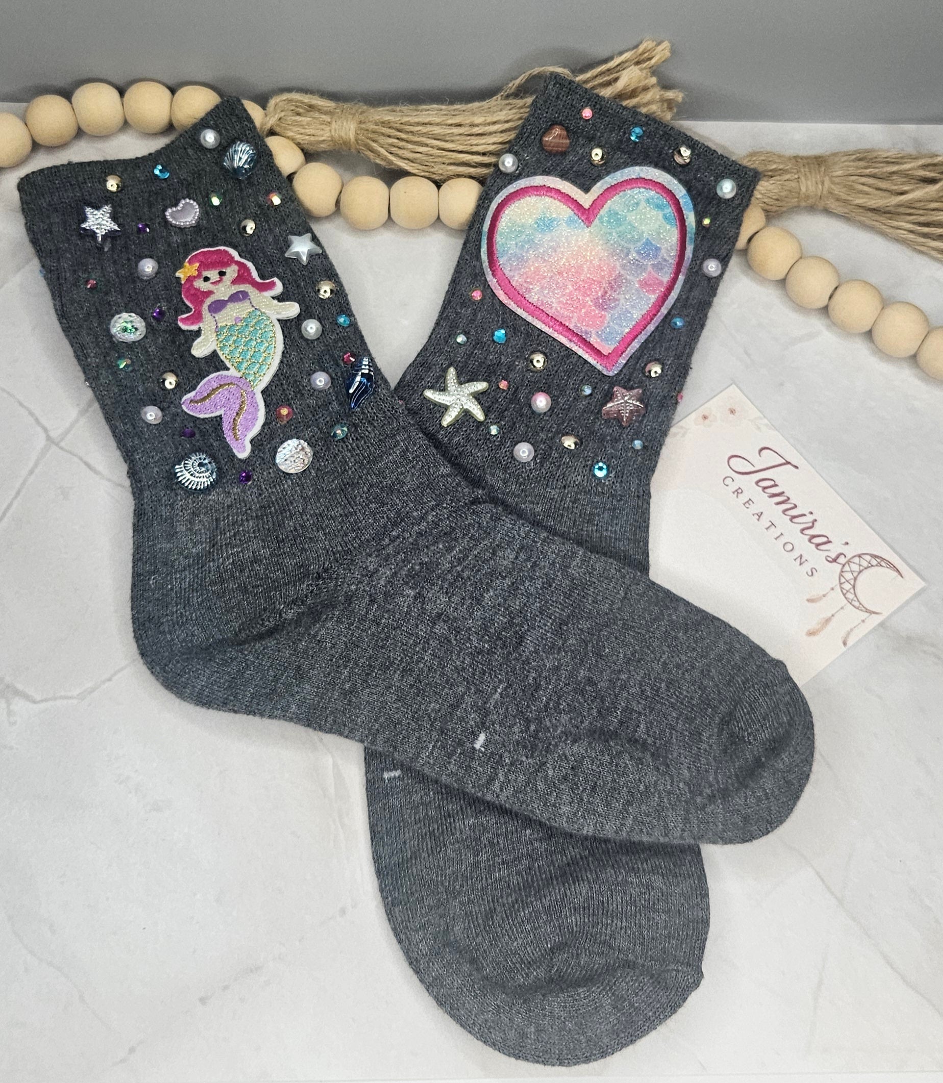 Dark gray socks with mermaid accents that capture the magic of the ocean and a dreamy soul.