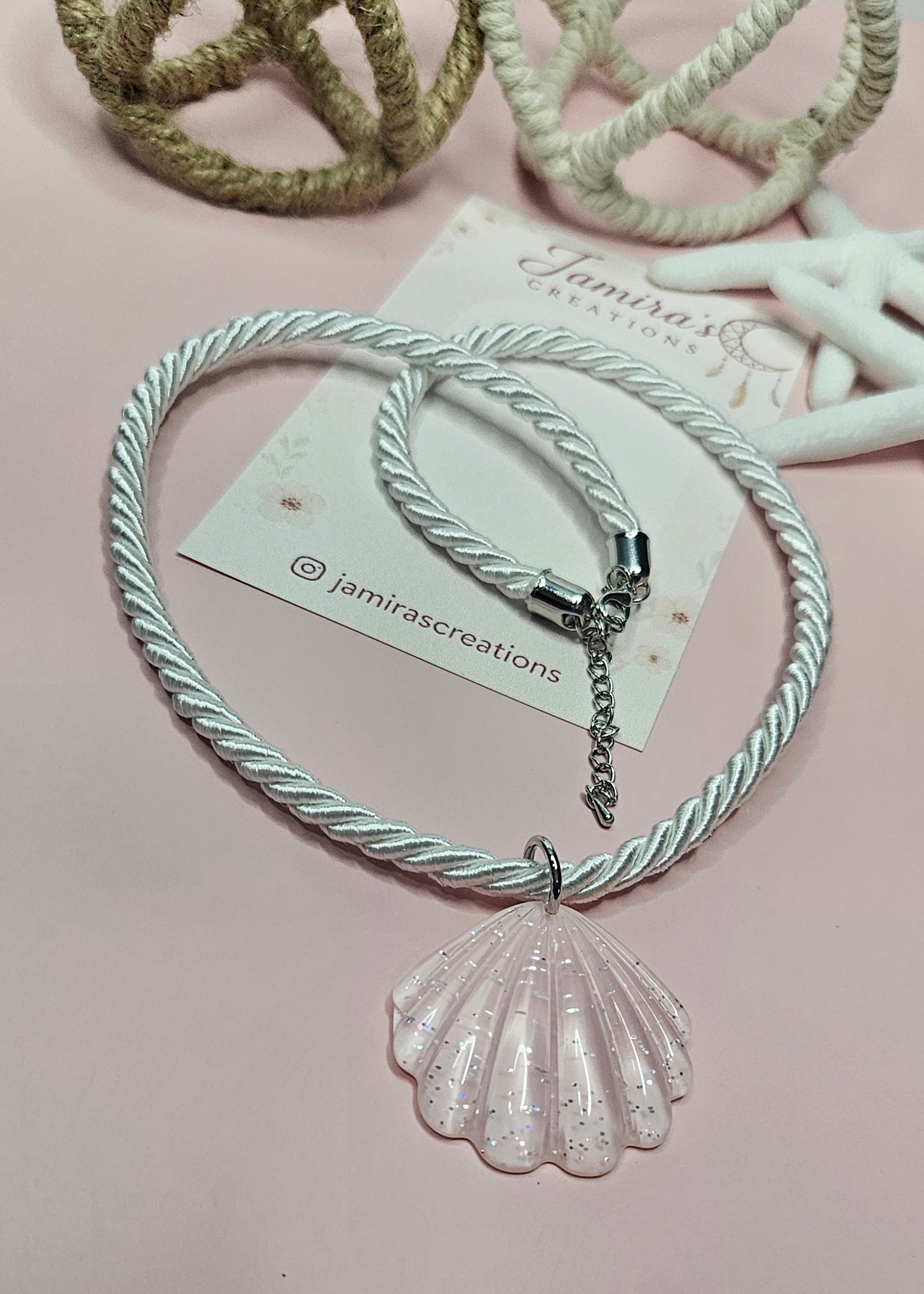 “Lleva un pedacito del mar contigo. ‘Concha rosa claro’ es un collar delicado hecho a mano con una concha rosada suave: un tierno recordatorio de mareas tranquilas, atardeceres de verano y momentos dulces.”