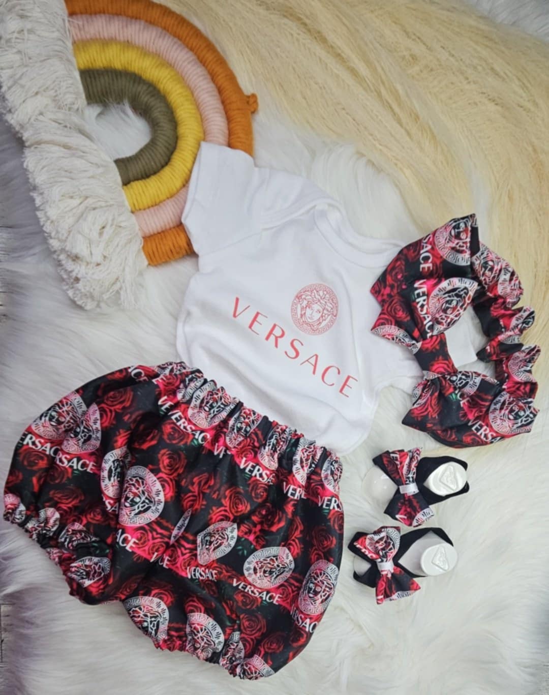 Versage Chic baby set, created to showcase style and elegance from the very first months. It includes modern pants, a soft onesie, a delicate bow, and barefoot sandals that complete the look with a sophisticated touch. The bold red, black, and white tones make it unique — perfect for special occasions or for letting your little one shine with personality.